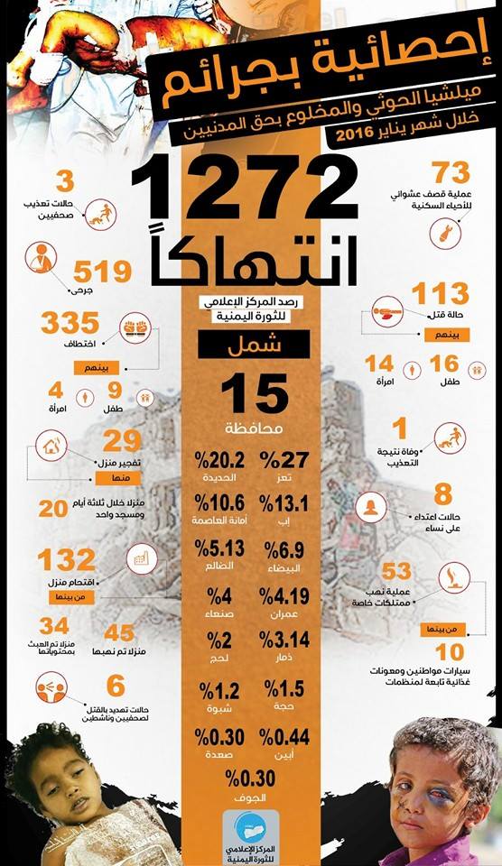 رصد المركز الاعلامي للثورة اليمنية احصائية بجرائم ميليشيات الحوثي والمخلوع بحق المدنيين خلال شهر يناير 2016 .