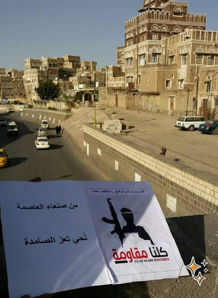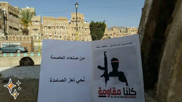 تداول ناشطون مجموعه من الصور التي تظهر منشورات وملصقات مؤيدة للمقاومة الشعبية والجيش الوطني في مختلف شوارع وأحياء ومناطق العاصمة صنعاء.