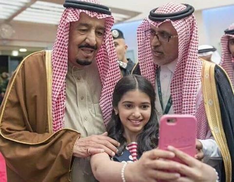 وحرصت الطفلة على التقاط صورة سيلفي مع خادم الحرمين الشريفين، باستخدام هاتفها الذكي، وقد ارتسمت على وجهها ابتسامة بريئة وعفوية مليئة بالثقة، فيما نظر الملك سلمان للكاميرا مبتسماً في مشهد أبوي.