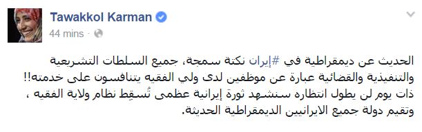 اعتبرت الناشطة اليمنية ,والحائزة على جائزة نوبل للسلام ,توكل كرمان، أن تطبيق الديمقراطية في إيران هو أمر مستبعد واصفة إياه بـ”النكتة السمجة”.
