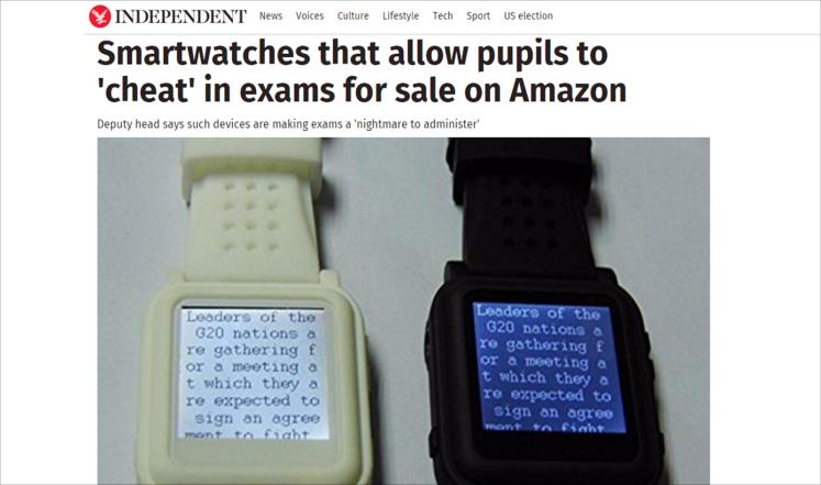 يعرض موقع أمازون التجاري عبر الإنترنت “ساعات ذكية” تسمح للطلبة بالغش في الامتحانات. وتبلغ سعة الذاكرة فيها 4 غيغابايت وتباع بنحو 64 دولارا.
