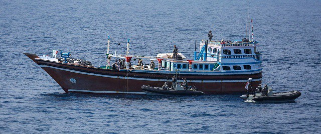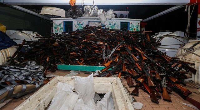 وقالت البحرية الأسترالية إن إحدى سفنها التي تقوم بدوريات في المنطقة، اعترضت سفينة صيد صغيرة، على بعد حوالي 170 ميلا بحريا قبالة ساحل عمان عندما عُثر عليها. وعلى متن عثرت السلطات على أكثر من ألفي قطعة من الأسلحة، شملت أكثر من 1.9 ألف رشاش “AK-47” ومائة قذائف صاروخية.