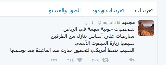 وفي تغريدة على حسابه بموقع التواصل الاجتماعي «تويتر»، قال «مجتهد»: «شخصيات حوثية مهمة في الرياض.. مفاوضات على أساس تنازل من الطرفين سبقها زيارة المبعوث الأممي.. السبب ضغط أمريكي لتحقيق تعاون ضد القاعدة بعد توسعها».
