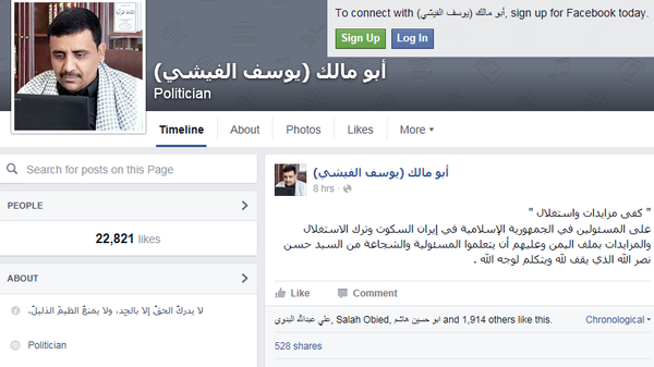 وبعد يوم واحد من قول جنرال إيراني إن طهران قد ترسل مستشارين عسكريين لمساعدة قوات الحوثيين الذين يقاتلون تحالفا بقيادة السعودية، قال يوسف الفيشي، عضو المجلس السياسي للجماعة وعضو ما يسمى بـ”اللجنة الثورية العليا” للحوثيين على صفحته في موقع التواصل الاجتماعي “فيسبوك”: “كفى مزايدات واستغلال. على المسؤولين في الجمهورية الإسلامية في إيران السكوت وترك الاستغلال والمزايدات بملف اليمن”.
