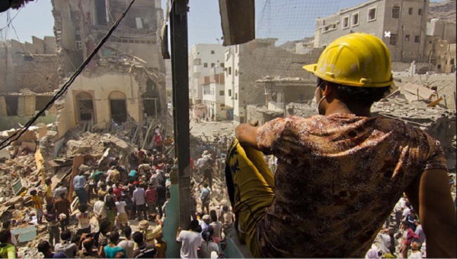 وتظهر الصورة التي فازت بالجائزة الأولى، بعدسة صالح باحليس، استراحة أحد متطوعي فرق الإنقاذ المدنية أثناء انتشال جثث الضحايا والعالقين تحت ركام المنازل، في القطيع، بمديرية كريتر، في مدينة عدن.