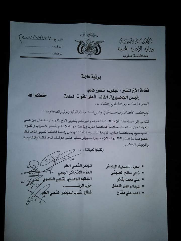 من جانب اخر طالبت الاحزاب السياسية اليمنية في محافظة مأرب في برقية عاجلة رفعتها الى الرئيس اليمني “عبدربه منصور هادي ” بعدم تغيير محافظ مأرب “سلطان العراده” .