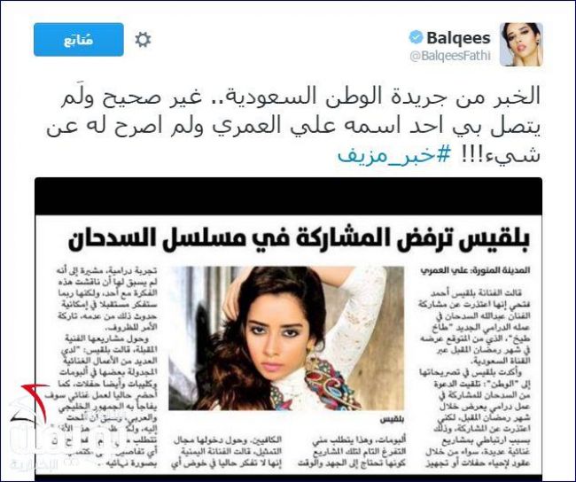 وأعلنت بلقيس في تغريدة لها عبر حسابها الرسمي في تويتر، بأن “الخبر من جريدة الوطن السعودية.. غير صحيح ولَم يتصل بي أحد اسمه علي العمري ولم اصرح له عن شيء!!!