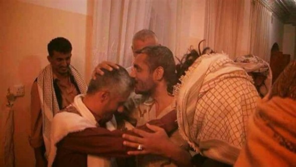 تظهر الصورة الفنان القرني يقبل رأس الشيخ المخلافي فور لقائه به بمدينة مأرب .