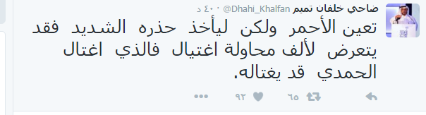 وفي تغريدة اخرى قال “خلفان: ” تعيين الأحمر ولكن ليأخذ حذره الشديد فقد يتعرض لألف محاولة اغتيال فالذي اغتال الحمدي قد يغتاله .
