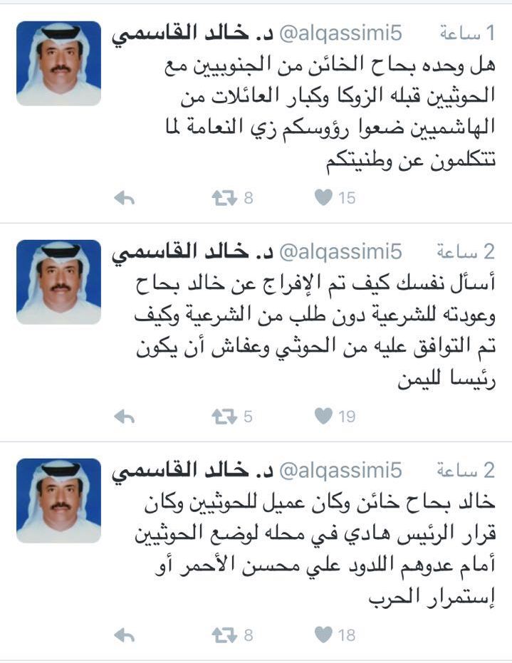 الدكتور القاسمي قال في سلسلة تغريدات : خالد بحاح خائن وكان عميل للحوثيين وكان قرار الرئيس هادي في محله لوضع الحوثيين أمام عدوهم اللدود علي محسن الأحمر أو استمرار الحرب .