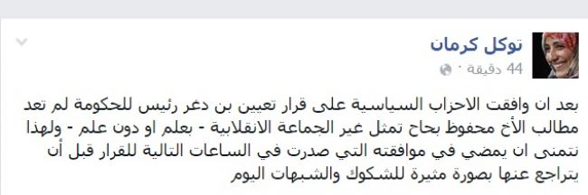 علقت الناشطة اليمنية الحائزة على جائزة نوبل للسلام توكل عبد السلام كرمان على البيان الذي اصدره خالد محفوظ بحاح ورفض فيه القرارات الرئاسية التي أصدرها الرئيس هادي وقضت باقالته
