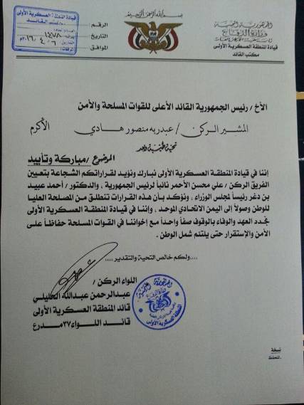 أعلن قائد المنطقة العسكرية الأولى، اللواء الركن، عبد الرحمن الحليلي، تأييده قرارات الرئيس عبد ربه منصور هادي الأخيرة، التي قضت بتعيين الفريق علي محسن نائبا لرئيس الجمهورية، والدكتور أحمد عبيد بن دغر، رئيسا لمجلس الوزراء.