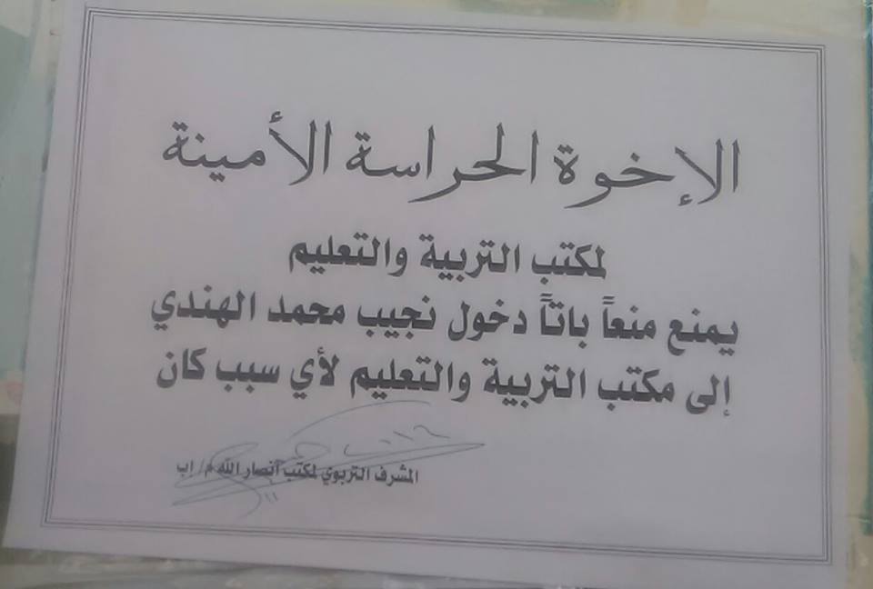 في خطوة تكشف حجم الخلاف القائم بين الحوثيين وحزب المخلوع صالح.. وجه اليوم المشرف التربوي في محافظة اب الحراسة الأمنية لمكتب التربية والتعليم في المحافظة بمنع رئيس فرع المؤتمر الشعبي العام في مديرية الظهار ونائب مدير عام مكتب التربية والتعليم نجيب الهندي من دخول مكتب التربية.
