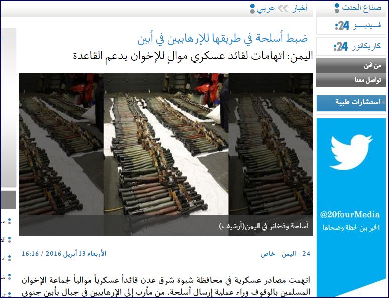 وتابع الموقع الإماراتي المذكور : “نقوم بالتحقيق مع سائق الناقلة، لكن المعلومات الأولية التي لدينا أن هذه الأسلحة في طريقها إلى القاعدة في جبال المحفد بأبين، وأرسلت من مأرب لهم، وهو ما يعزز شكوكنا بتورط قائد عسكري رفيع موال لجماعة الإخوان المسلمين الإرهابية بدعم جماعات الإرهاب والتطرف في جنوب اليمن”.