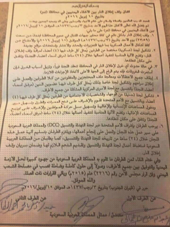 شاهد صورة الوثيقة التي وقّع عليها الحوثيون جنوب السعودية “شكرا سلمان” وتتضمن وقف إطلاق النار في تعز