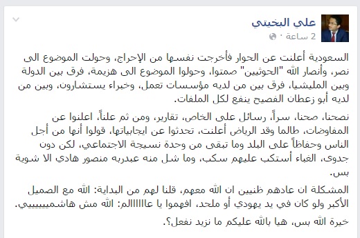 سخرالقيادي المستقيل من جماعة انصار الله الحوثية “علي البخيتي”في منشورٍ له على صفحته بموقع التواصل الاجتماعي “فيس بوك” من الجماعة وذلك في تعليقه على حوار الجماعة مع السعودية والوثيقة المسربة التي تداولها ناشطون على مواقع التواصل الاجتماعي .