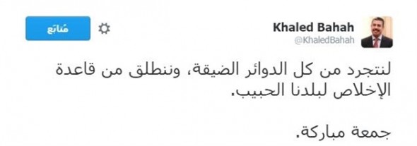 وكتب بحاح في تغريدته التي نشرها على تويتر ” لنتجرد من كل الدوائر الضيقة ، وننطلق من قاعدة الإخلاص لبلدنا الحبيب ” .. مختتما تغريدته بتهنئة الجميع بحلول يوم الجمعة المباركة.