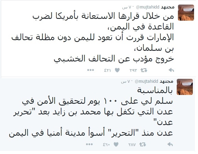 اعتبر المغرد الشهير “مجتهد” أن طلب الامارات المشاركة بقوة عسكرية في اليمن ضد القاعدة بمثابة قرار العودة الى واجهة الاحداث ولكن تحت المظلة الامريكية.