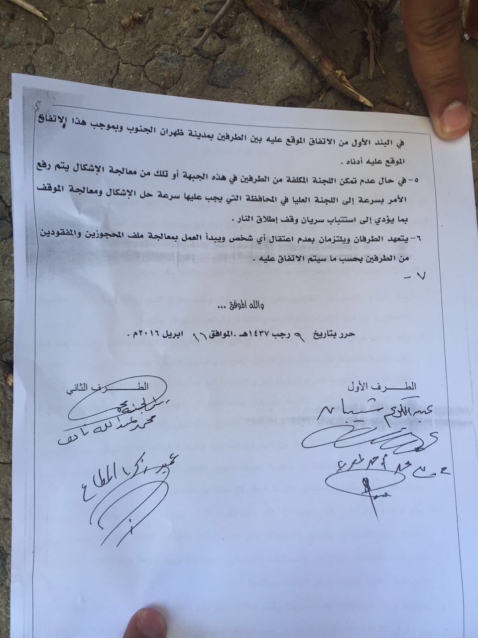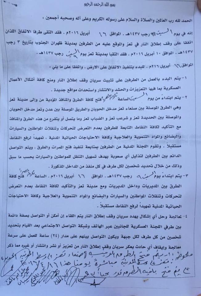 وثيقة الاتفاق الذي رعته لجنة الاشراف على وقف اطلاق النار والذي يتضمن فك المنافذ الرئيسة لمدينة تعز والتهدئة بمختلف الجبهات بين المقاومة الشعبية ومليشيا الحوثي والمخلوع.