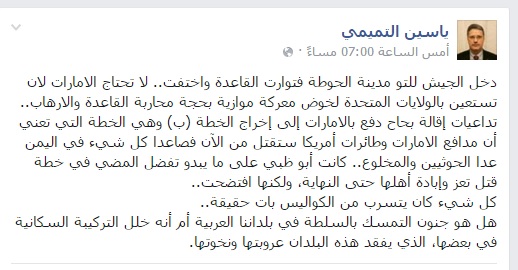 جاء ذلك كأول تعليق للصحفي “التميمي” على الأنباء التي تحدث عن تقديم الإمارات لطلب إلى الولايات المتحدة بشأن تقديم دعم عسكري لها من أجل مواجهة التنظيمات الإرهابية في اليمن .