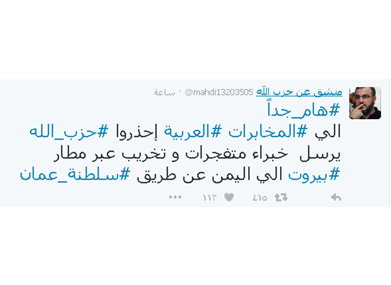 وقال “منشق” في التغريدة التي حملت عنوان “هام جدا” “هام جدا إلى المخابرات العربية، إحذروا حزب الله يرسل خبراء متفجرات وتخريب عبر مطار بيروت إلى اليمن عن طريق سلطنة عمان”.