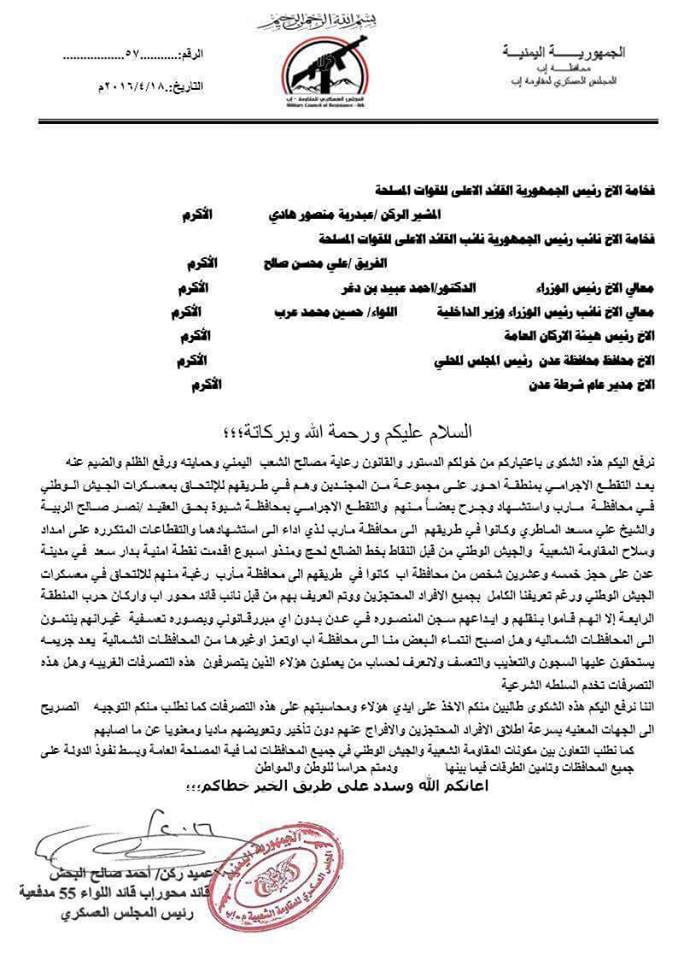 والتقطع الإجرامي بمحافظة شبوة بحق العقيد / نصر صالح الربية والشيخ علي مسعد الماطري وكانوا في طريقهم إلى محافظة مارب الذي أدى إلى استشهادهما والتقطاعات المتكررة على امداد وسلاح المقاومة الشعبية والجيش الوطني من قبل النقاط بخط الضالع لحج ومنذ اسبوع اقدمت نقطة امنية بدار سعد في مدينة عدن على حجز خمسة وعشرين شخص من محافظة إب كانوا في طريقهم إلى محافظة مارب رغبة منهم للألتحاق في معسكرات الجيش الوطني ورغم تعريفنا الكامل بجميع الافراد المحتجزين وتم التعريف بهم من قبل نائب قائد محور اب واركان حرب المنطقة الرابعة