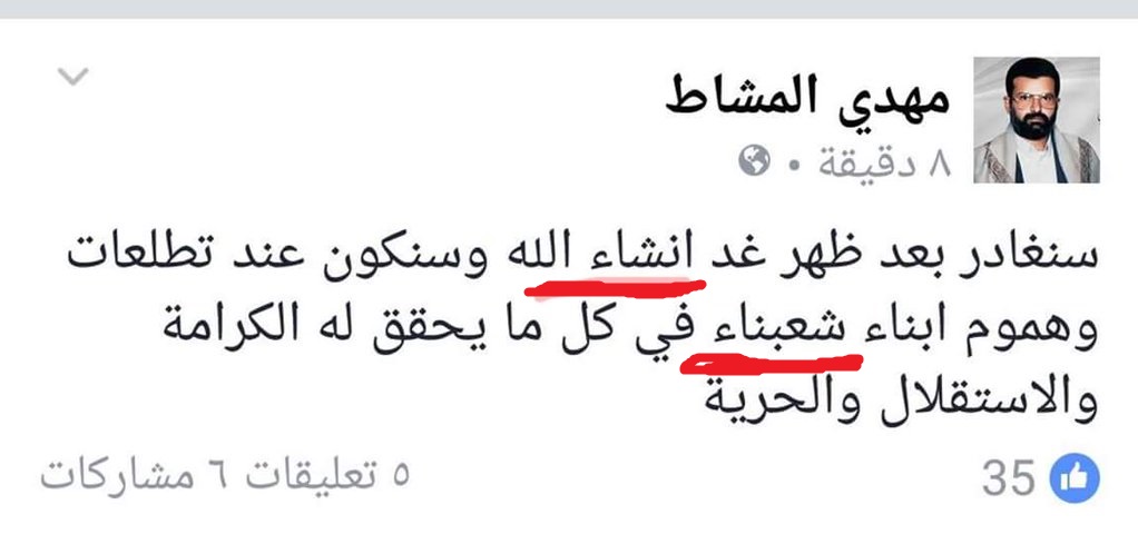 أعلن رئيس وفد الحوثيين المتجه إلى الكويت مهدي المشاط عن موعد مغادرة وفده برفقة وفد المؤتمر الذي يترأسه القيادي عارف الزوكا.