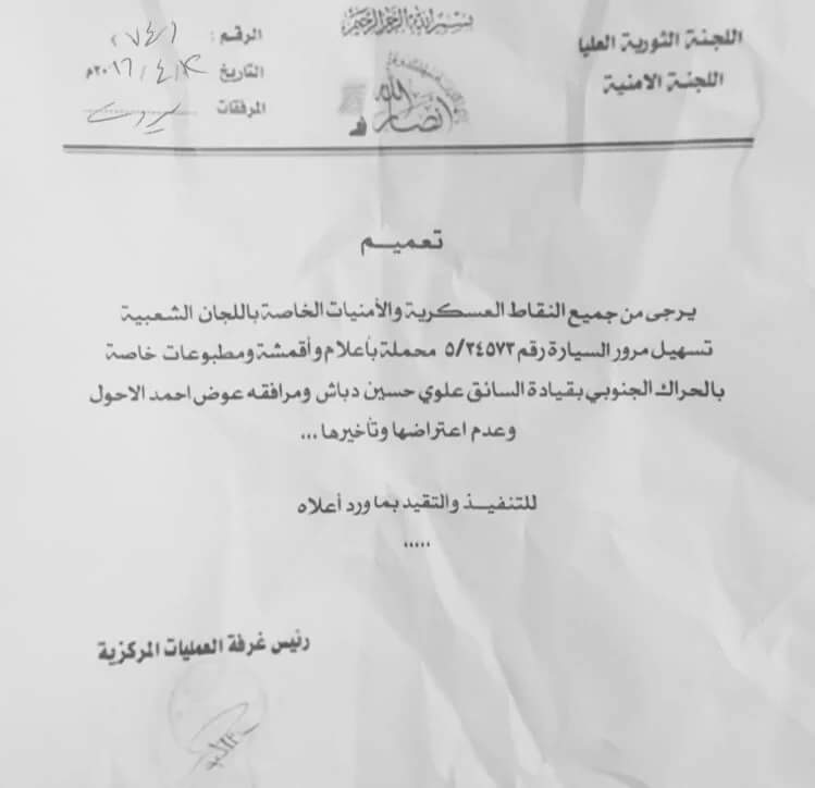 الوثيقة جاءت على صورة تعميم الى كافة النقاط الحوثية بعدم اعتراض اعلام الحراك الجنوبي وسياراتهم وتسهيل مرورهم والسماح لسيارة محملة باعلام واقمشة ومطبوعات خاصة بالحراك الجنوبي بقيادة السائق علوي حسين دباش ومرافقه.