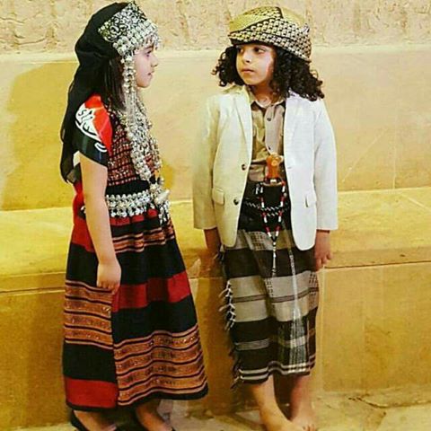 ويظهر في الصورة طفل وطفلة يمنيين مغتربين في مدينة جدة وهما يرتديان الزي اليمني المعروف.