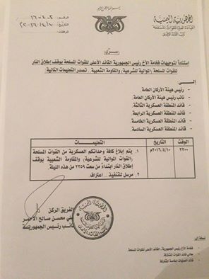 كشفت وثائق جديدة عن توجيهات أصدرتها قيادة الجيش الشرعي بالألتزام بوقف اطلاق النار مع استمرار الحوثيين وقوات صالح بخرق الهدنة في محافظات الجمهورية اليمنية.