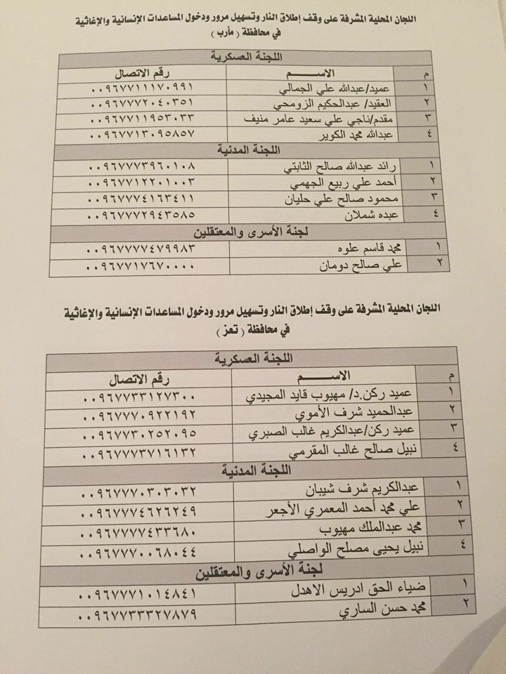 كما تظهر وثائق أخرى أسماء وأرقام هواتف المراقبين على الهدنة في سبع محافظات يمنية بينها مارب وتعز وشبوة والجوف والضالع والبيضاء.