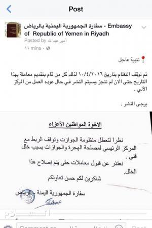 اعلن القسم القنصلي بالسفارة اليمنية في الرياض عن توقف كافة المعاملات الخاصة باستخراج جوازات السفر أو منح جوازات بدل فاقد أو إضافة المواليد بسبب خلل فني وتوقف الربط مع المركز الرئيسي لمصلحة الهجرة والجوازات .