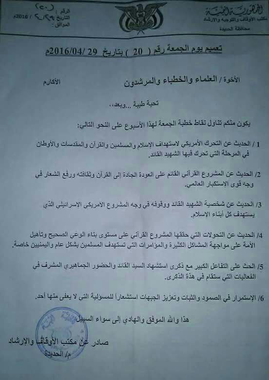 ففي محافظة الحديدة اصدر مكتب الاوقاف والارشاد الواقع تحت سيطر مليشيا الحوثي تعميما جديدا لجميع خطباء المساجد في المحافظة بشان مادة الخطبة ليومنا هذا الجمعة 29ابريل 2016.