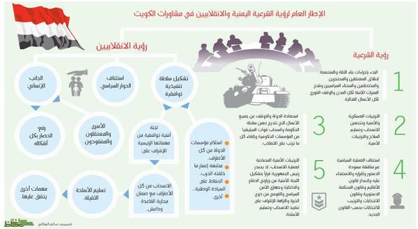وذكرت وكالة الأنباء اليمنية الرسمية أن وفد الانقلاب قدم أمس رؤية كشفت عن استمراره في الانقلاب على مبادئ ومرجعيات المشاورات المتمثلة في قرارات الشرعية الدولية وفي مقدمتها 2216 والمبادرة الخليجية ومخرجات الحوار، والتهرب من تسليم السلاح ومحاولة شرعنة الانقلاب واغتصاب مؤسسات الدولة.