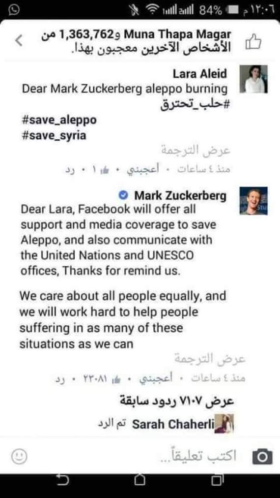 وقال زوكربيرغ: “سيقوم فيسبوك بتقديم كل الدعم والتغطية الإعلامية لإنقاذ حلب، وكذلك التواصل مع الأمم المتحدة ومكاتب اليونسكو، شاكرين فضل تذكيركم لنا”.