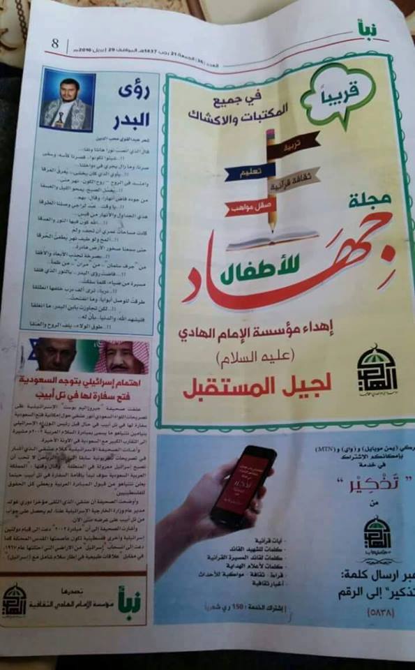 وفي الإعلان الذي أخذ نصف أحد صفحات صحيفة ” نبأ ” التابعة لما يمسى ” مؤسسة الأمام الهادي الثقافية “، حمل ترقب وبشرى لمجلة جديدة موجهة للأطفال وتحمل اسم ” مجلة جهاد الاطفال ” وهو ما سخر منه الناشطون .