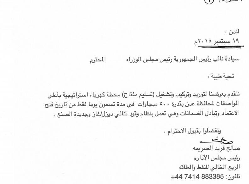 وبحسب الوثيقة فإن رجل الأعمال اليمني صالح بن فريد الصريمة قدم عرضاً بتوريد محطة لمحافظة عدن بقدرة 500 ميجاوات خلال مدة تسعون يوماً من تاريخ فتح الإعتمادات وتبادل الضمانات لكن خالد بحاح عمل على إفشال العرض.