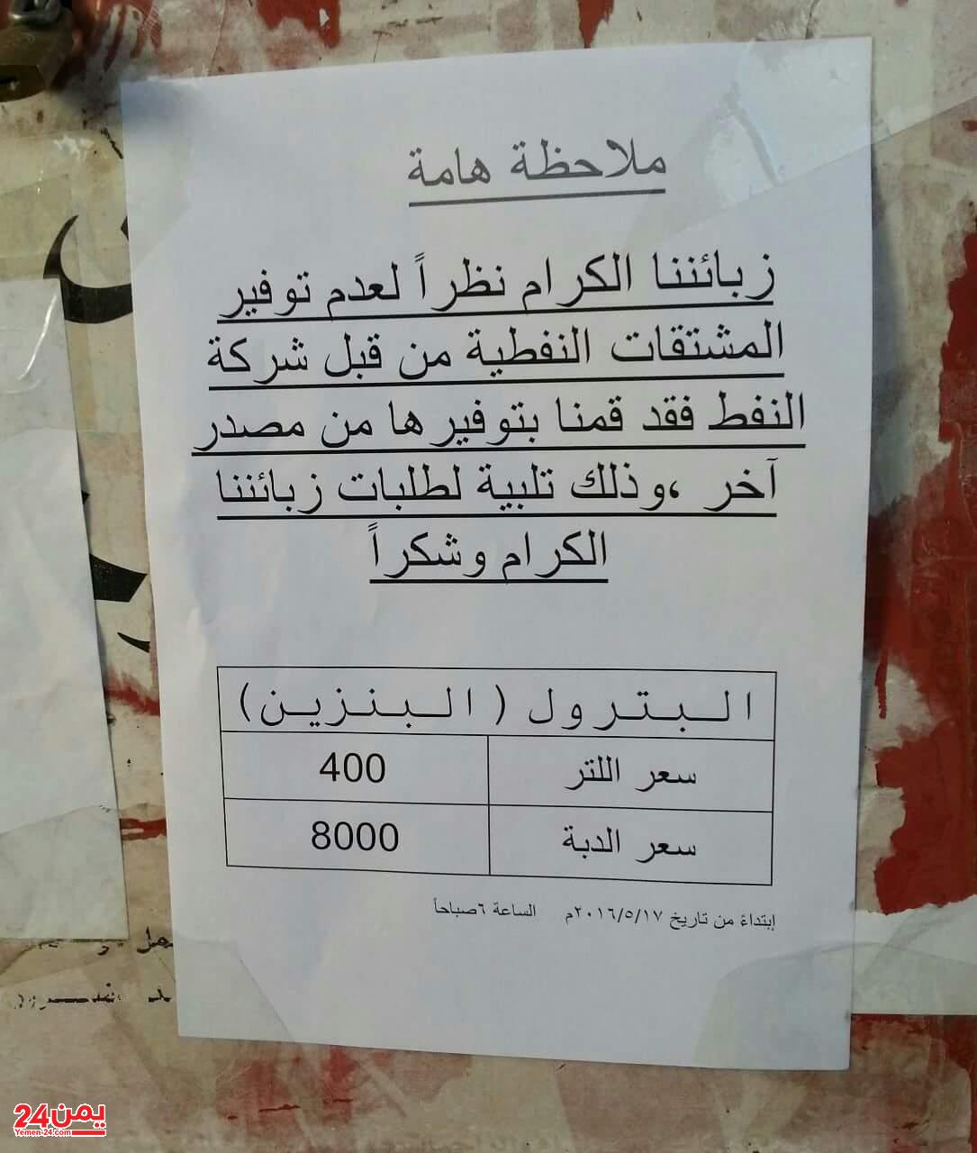 و رفعت بعض المحطات لوحات اعلانية تحمل السعر الجديد للنفط حيث اصبح سعر اللتر البترول 400 ريال يمني اي ان سعر العشرين لتر “الدبة” 8000ريال يمني.