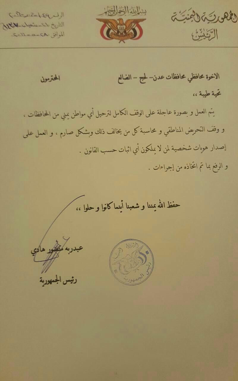 توجيهات للرئيس هادي حول ترحيل ابناء المحافظات الشمالية من عدن (وثيقة)