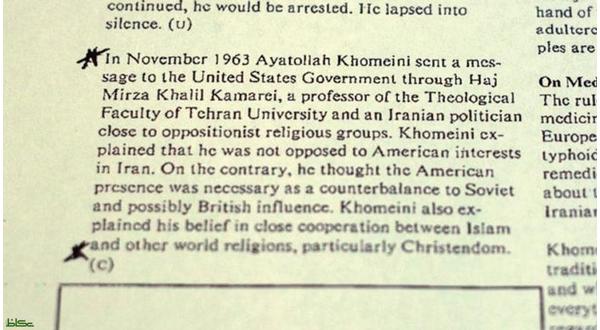 وتشير الوثائق، إلى أن الولايات المتحدة أبلغت مبعوث الخميني، بعد يومين من مغادرة الشاه، بأنها مع تغيير الدستور في إيران، وكشفت له معلومة رئيسية مهمة تفيد بأن القادة العسكريين الإيرانيين مرنون تجاه مستقبلهم السياسي. وأشارت ( BBC) إلى أن تلك الاتصالات ليست الأولى من نوعها بين الخميني والإدارة الأمريكية، إذ تبين أنه كان قد تبادل «رسائل سرية» مع الرئيس الأمريكي الأسبق جون كيندي أثناء وجوده تحت الإقامة الجبرية في طهران في العام 1963، يدعو فيها الإدارة الأمريكية إلى عدم تفسير هجومه على سياسة الشاه، بأنه يعادي واشنطن، مؤكدا أنه ليس ضد المصالح الأمريكية في إيران، ويعتبر الوجود الأمريكي ضروريا لمعادلة التوازن للنفوذ السوفيتي وربما البريطاني. وتوضح إحدى الوثائق التي نشرتها وكالة الاستخبارات الأمريكية، أن الخميني تبادل رسائل سرية مع الرئيس الأمريكي الأسبق جون كيندي بعد أشهر من الإفراج عنه من السجن في إيران مطلع نوفمبر عام 1963، وأنه طالب خلالها بألا «يفسر هجومه اللفظي بطريقة خاطئة، لأنه يحمي المصالح الأمريكية في إيران».