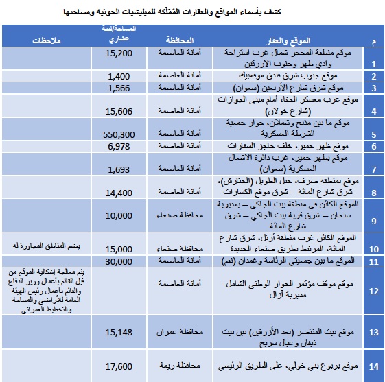 14 موقعا هاما من أراض وعقارات الدولة، بمساحات كبيرة، بعضها خيالية، تم استباحتها بقرار واحد لما تسمى بمؤسسة الشهيد الحوثية. حددتها الوثيقة في اربع محافظات، موزعة على النحو التالي: –