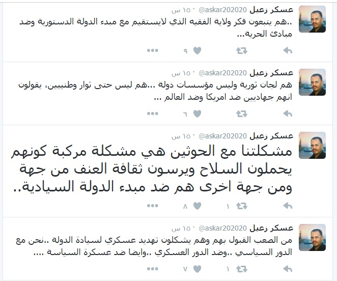 واضاف العميد زعيل في سلسلة تغريدات نشرها على حسابه بموقع التواصل الاجتماعي تويتر ان مليشيا الحوثي تتبع “فكر ولاية الفقيه الذي لا يستقيم مع مبدء الدولة الدستورية وضد مبادئ الحرية” مشيرا الى ان ” مشكلتنا مع الحوثين هي مشكلة مركبة كونهم يحملون السلاح ويرسون ثقافة العنف من جهة ومن جهة اخرى هم ضد مبدء الدولة السيادية”.