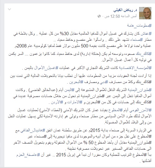 وجاء في منشور له على صفحته بموقع التواصل الاجتماعي ان الرئيس المخلوع علي عبدالله صالح شارك في انشطة مالية مشبوهة وعمليات غسيل اموال متعددة عبر مؤسسات مختلفة في البلاد.