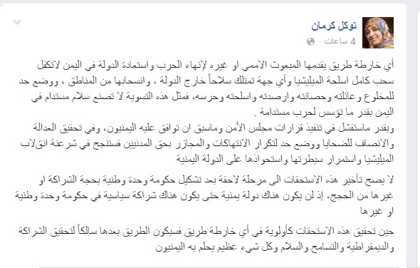 قالت الناشطة اليمنية والحاصلة على جائزة نوبل للسلام توكل كرمان ان ” أي خارطة طريق يقدمها المبعوث الأممي أو غيره لإنهاء الحرب واستعادة الدولة في اليمن لاتكفل أولاً سحب كامل أسلحة الميليشيا وأي جهة تمتلك سلاحاً خارج الدولة، وانسحابها من المناطق، ووضع حد للمخلوع وعائلته وحصانته وأرصدته وأسلحته وحرسه، فمثل هذه التسوية لا تصنع سلام مستدام في اليمن بقدر ما تؤسس لحرب مستدامة”.