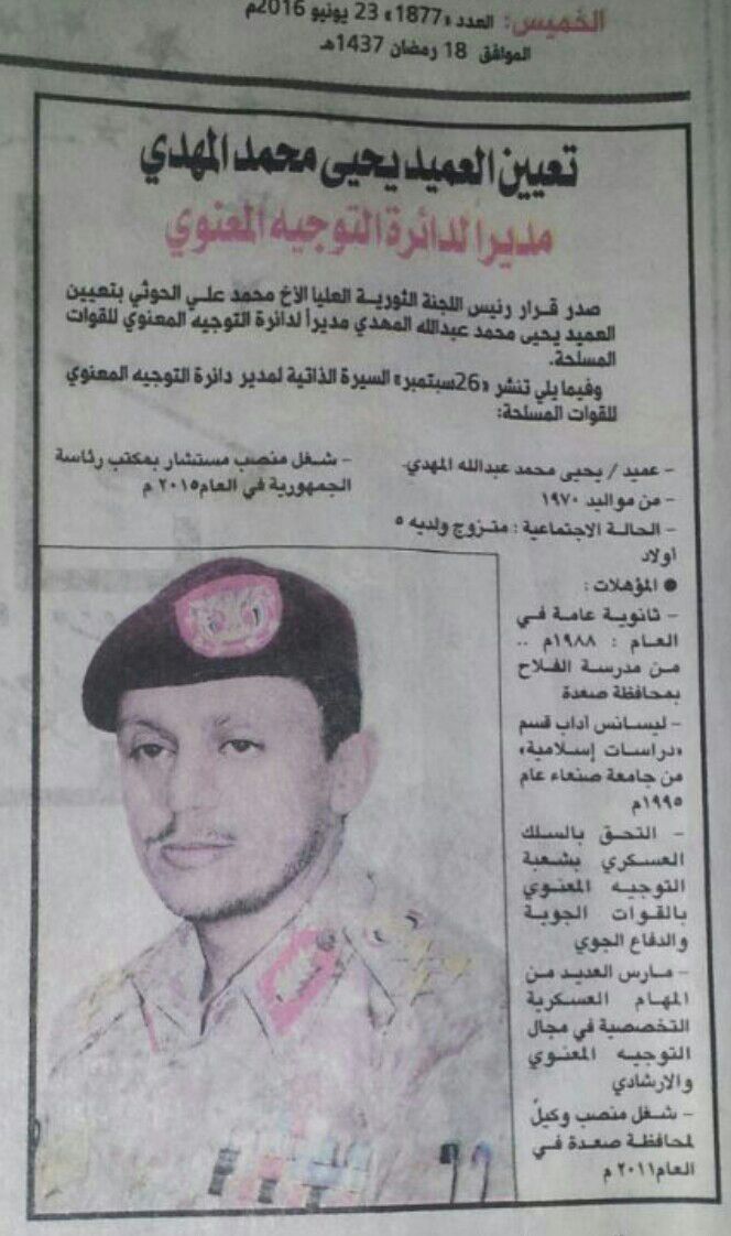 وكانت صحيفة 26 سبتمبر التابعة للقوات المسلحة اليمنية والخاضعة لسيطرة جماعة الحوثي منذ دخولها العاصمة صنعاء في سبتمبر 2014 قد نشرت في عددها (1877) يوم امس الخميس خبرا عن قرار تعيين “يحيى محمد المهدي” مديراً لدائرة للتوجيه المعنوي بالإضافة إلى نشرها السيرة الذاتية.