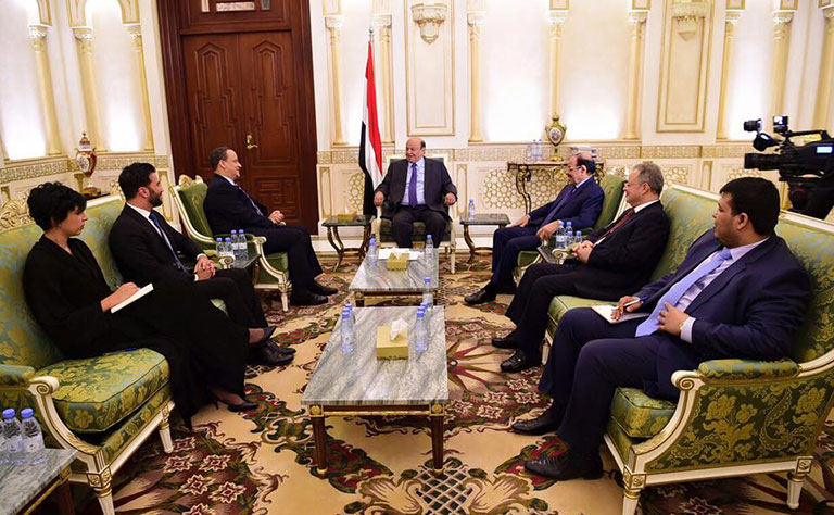 وشدد هادي، خلال اللقاء الذي حضره نائبه علي محسن الأحمر، على ضرورة تطبيق الانقلابيين للقرارات الدولية، ومنها القرار الأممي 2216 كأساس لأي حل للأزمة، مؤكداً رفض المماطلة والتسويف ومحاولات الالتفاف على القرارات الدولية.