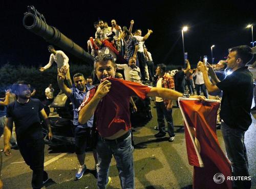 وخرج الشعب التركي الى الشوارع بعد ساعات من دعوة الرئيس التركي رجب طيب اردوغان من اسطنبول فيما انقسم الجيش ووقعت اشتباكات في العاصمة التركية انقرة بين اقراد من الجيش وقوات الشرطة ما اسفر عن مقتل 17 عنصرا من الشرطة .