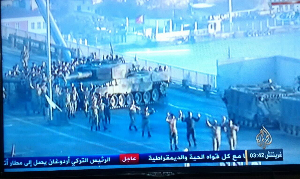 بثت قناة الجزيرة صور مباشرة قبل قليل توضح عشرات الجنود وهم يلقون با سلتحهم ويرفعون ايديهم في ملية على ما يبدو انها عملية استسلام لعناصر من الجنود المشاركين في عملية الانقلاب الفاشلة التي حدثت ليلة الجمعة.