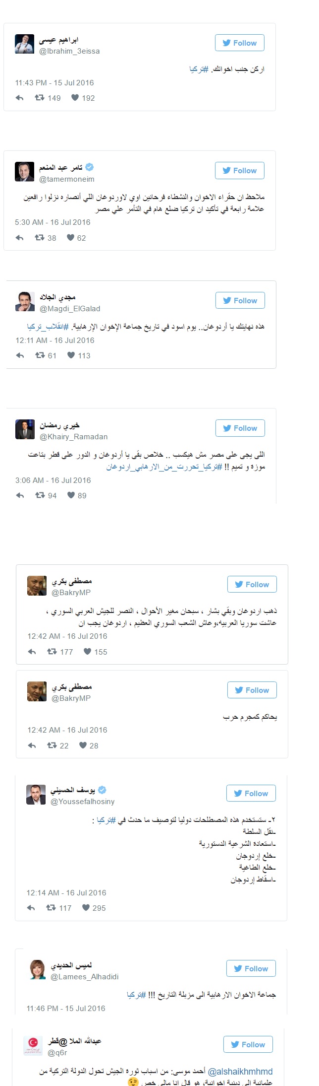 من جهته، قال الصحفي مصطفى بكري، إن اردوغان حاول ان يكرر سيناريو الاخوان في مصر – سلطات ديكتاتوريه – الجماعه محل الدوله – تعديل الدستور بحيث يأتي وفقا لرغباته. وأضاف في سلسلة تغريدات أخرى: