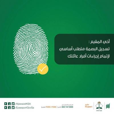 دعت المديرية العامة للجوازات السعودية المقيمين بسرعة المبادرة بتسجيل الخصائص الحيوية ”البصمة“ لهم ولإفراد عائلاتهم.